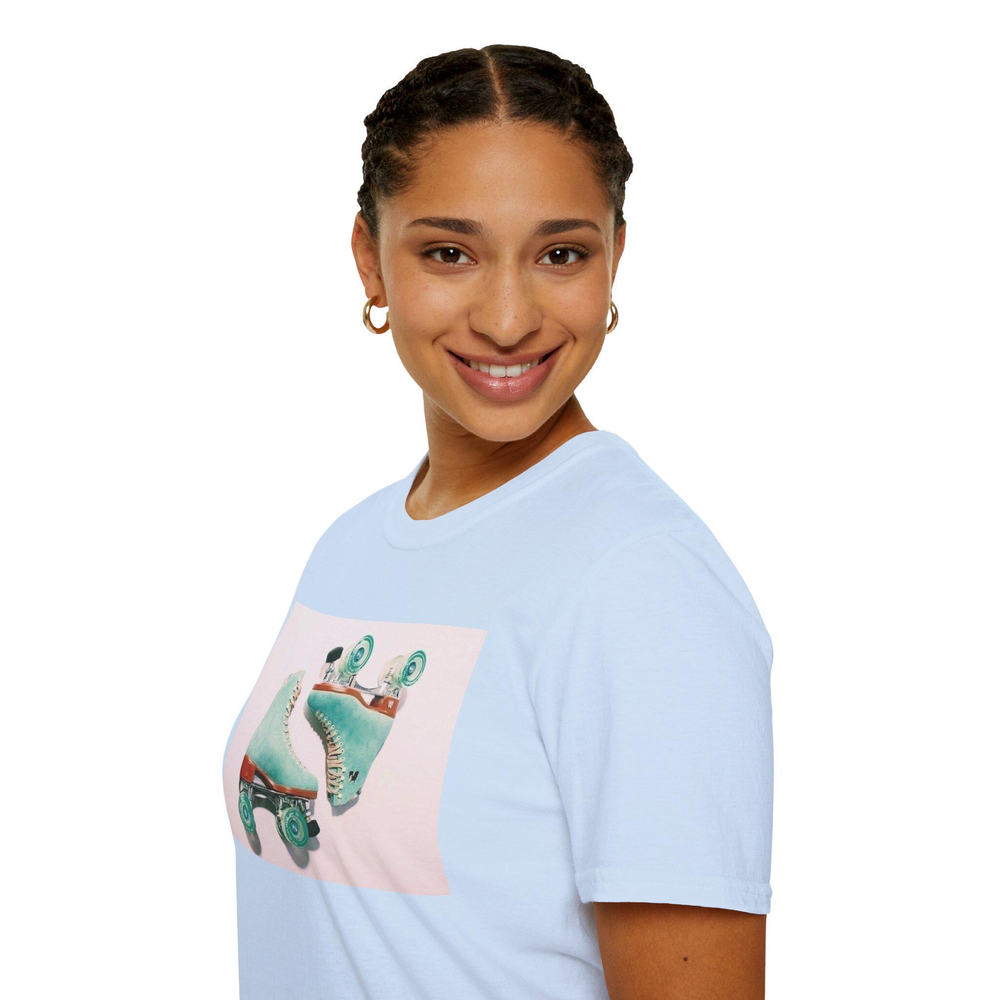 A soft, vintage-tinged tee that brings the carefree buzz of roller rinks and boardwalk afternoons into everyday wear. The smooth 100% ring-spun cotton feels light and breathable, while the pastel roller skate graphic adds a playful, nostalgic touch. Wear it on slow Sundays, out for a spin with friends, or layered under a denim jacket for a retro-inspired look that still reads modern. The image sits cleanly on the chest, letting the gentle mint and blush tones do the talking — subtle, cheerful, and a little bit dreamy.