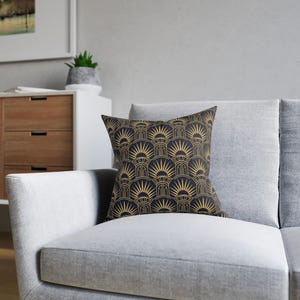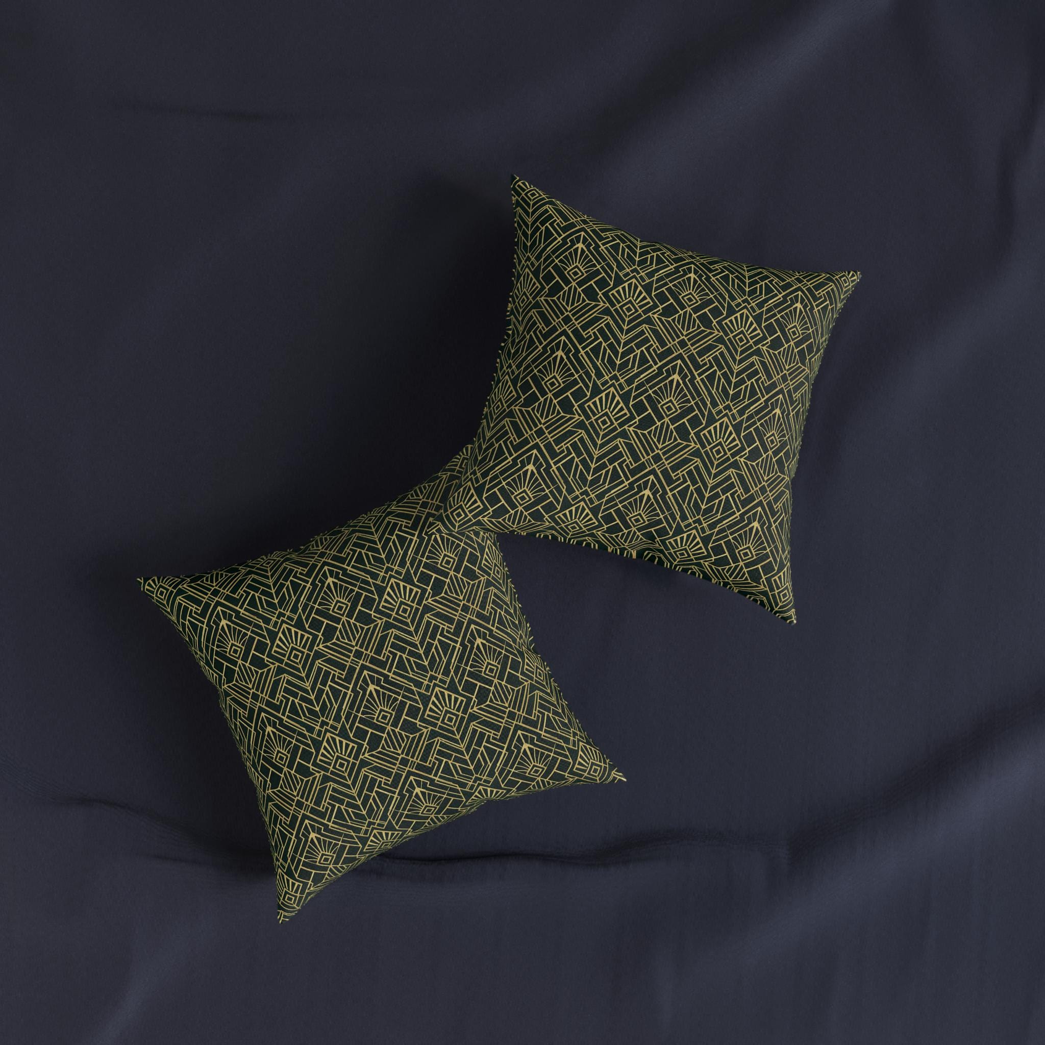 Deep emerald and antique-gold geometry come together on a plush square pillow that feels like a small piece of Art Deco luxury. The dense, faux-suede face holds crisp, double-sided printing that keeps the intricate fan-and-line pattern bold and luminous. It’s the kind of accent that quiets a room: rich color, tactile softness, and a structured design that anchors sofas, reading nooks, or a moody bedroom. Slip it onto your favorite chair to add layered texture and a touch of vintage glamour — the concealed zipper keeps the look seamless while making care simple.