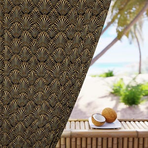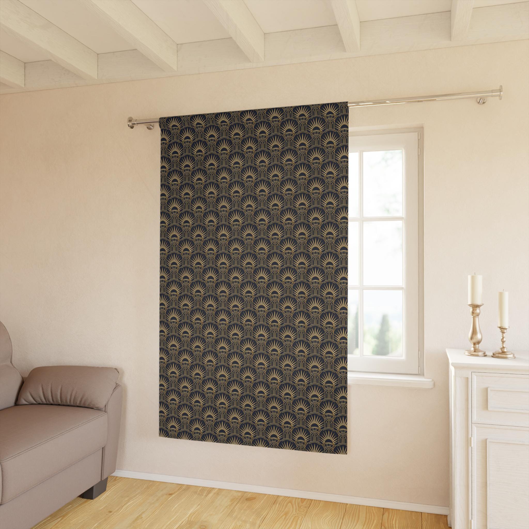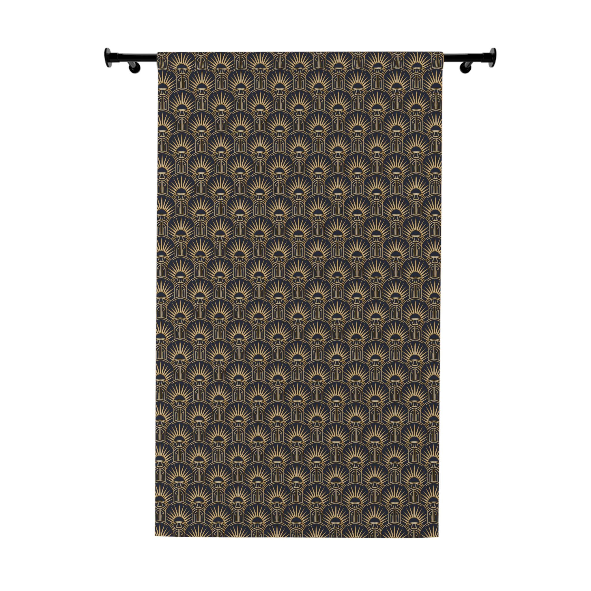 Bring a layer of moody, vintage glamour to your room with this blackout curtain. The rich, art-deco inspired fan pattern in deep charcoal and antique gold tones creates a quiet, cinematic backdrop that softens daylight and adds texture to a reading nook, living room, or bedroom. Heavy enough to block most streetlight and sun, the medium-weight polyester keeps its shape and drape while the sewn hem and rod pocket make hanging simple and secure. Let it be the silent scene-setter for slow mornings, movie nights, or evenings spent curled up with a book.